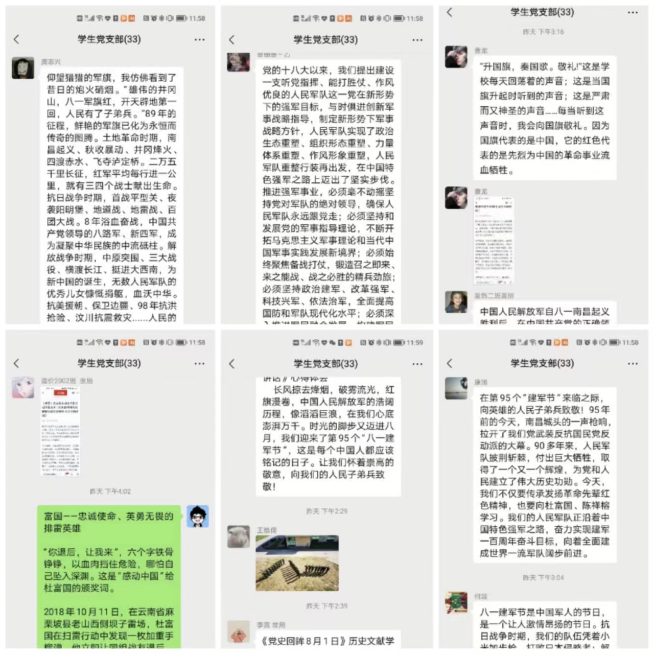 为庆祝中国人民解放军建军95周年,弘扬爱党爱国爱军精神,进一步深化党史学习教育,bat365中文官方网站学生党支部组织全体党员开展庆祝“八一”建军节主题党日活动。活动采取党员居家自学形式,每位党员阅读军事题材的书籍或者文章,收看军旅题材影片或视频,并将学习内容、学习感悟及体会通过支部微信群,与支部党员分享。