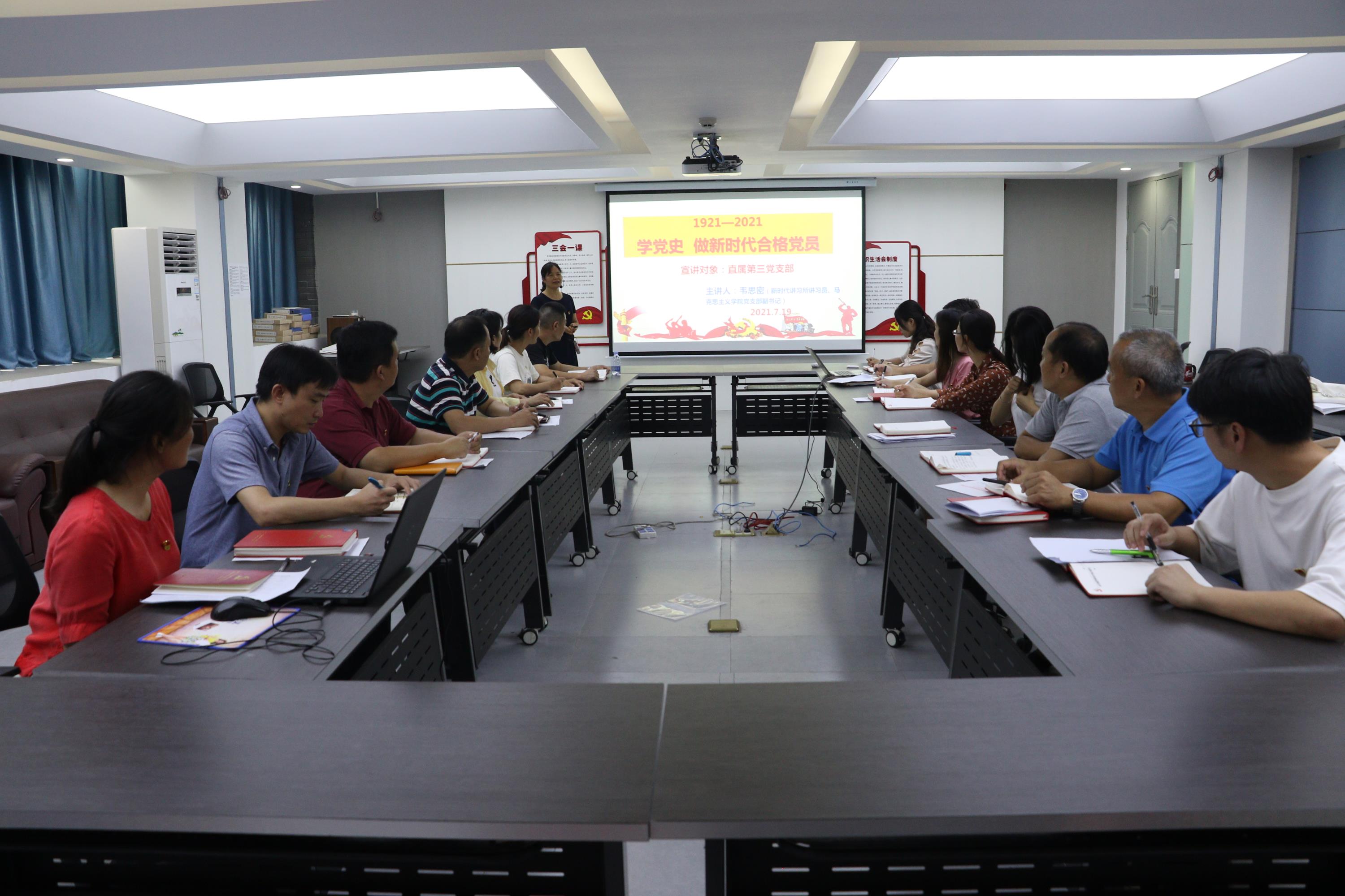 马克思主义学院党支部副书记韦思密以《学党史 做新时代合格党员》为主题为直属第三党支部、直属第四党支部宣讲。