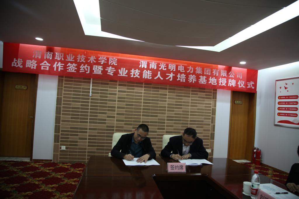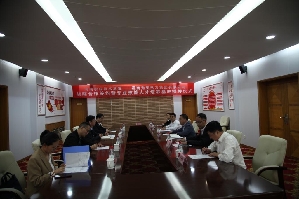 5月25日上午,bat365中文官方网站与渭南光明电力集团有限公司战略合作签约暨专业技能人才培养基地授牌仪式在华阴市莲花山庄举行。渭南光明电力集团有限公司主管领导徐斌副总经理,光明电力集团有限公司董事长郭峰及相关部门负责人,bat365中文官方网站党委副书记党少平,副院长王韦华,bat365中文官方网站院长孙志强,建筑工程教研室副主任王宁宁等教师代表出席了本次活动。
