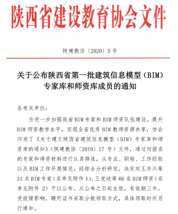 近日,陕西省建设教育协会印发了《关于公布陕西省第一批建筑信息模型(BIM)专家库和师资库成员的通知》(陕建教协〔2020〕5号)文件,bat365bat365中文官方网站青年教师张银环入选BIM专家库,青年教师王婷、高乐、杨红娟入选BIM师资库。