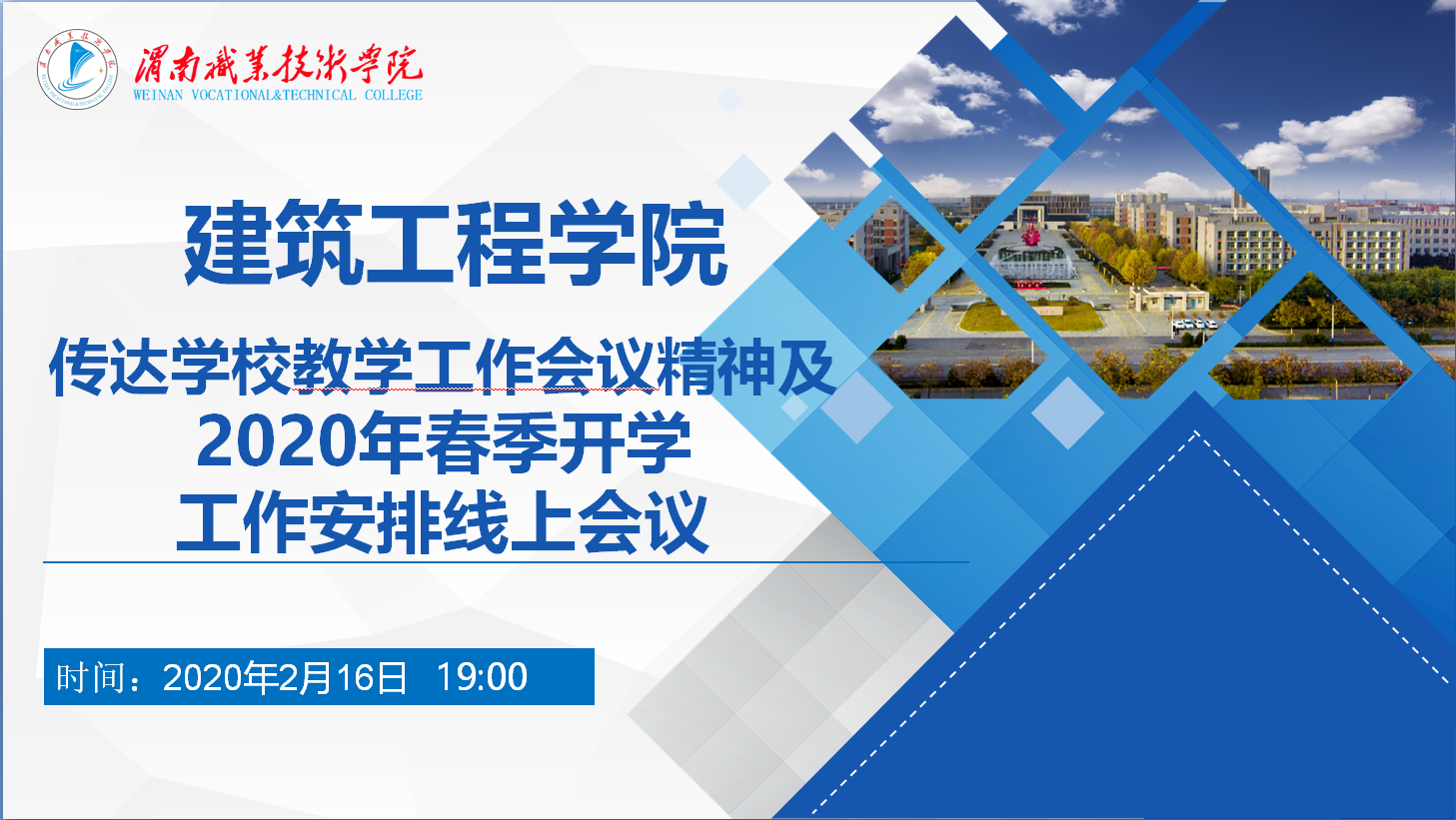 为进一步做好疫情防控期间的教学组织与管理工作,传达学校教学工作会议精神及2020年春季开学安排,bat365中文官方网站于2月16日19点召开线上工作会议。会议由建工学院院长孙志强主持,校教务处教务科科长蒲飞及建工学院全体教职工参加了会议。
