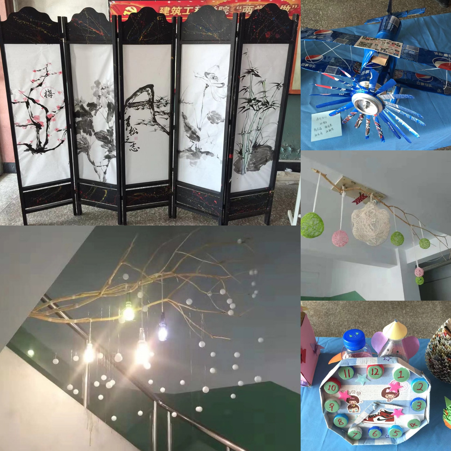 24日上午,在bat365中文官方网站教学楼内,同学们的作品进行了集中展示。变废为宝的创意装置吊灯,是由建筑装饰工程技术专业学生利用生活中不起眼的枯树枝、废旧酒瓶结合专业所学,在老师们的指导下安装展示;工程造价专业学生利用易拉罐、瓶盖、废旧纸盒制作了钟表、储物盒、喷气式战斗机等,其中同学们利用易拉罐做成的这架飞机也象征着改革开放40年祖国的腾飞;工程造价专业学生妙笔生花秀书法、建筑装饰专业学生废品艺术展创意,大家齐心协力各显神通利用废旧木板制作了一面优美的国画屏风。