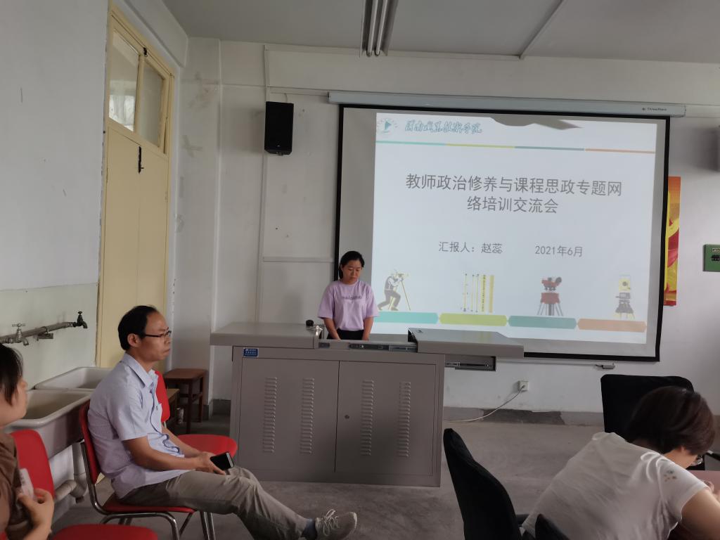 杨红娟分享了“建筑信息模型BIM”培训中BIM相关知识,王之怡分享了“教学能力提升”培训中关于教案编写心得,赵蕊分享了培训中关于“教师政治修养与课程思政”思政要素融入方式,高乐分享了“师德师风与思政教育”培训中关于新时代下高职教师的责任与担当的内容。