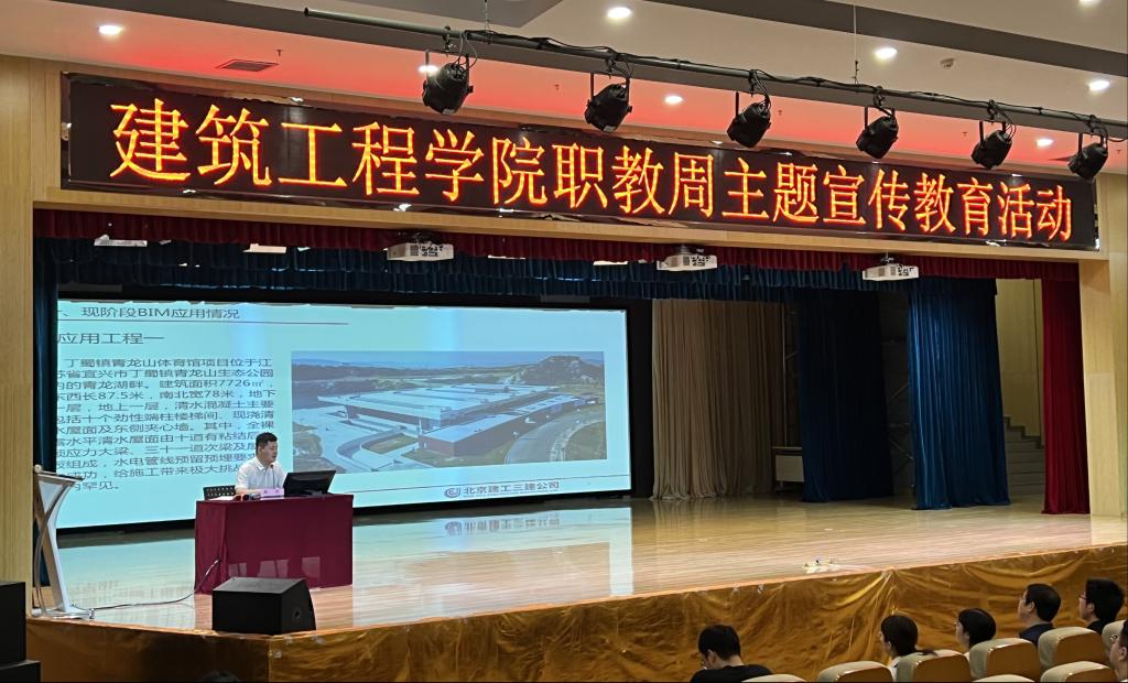 其次,由北京建工集团三建公司清水事业部副经理BIM技术中心BIM工程师杨波作BIM技术应用专题讲座。杨经理结合自己做的实际项目丁蜀镇青龙山体育馆项目、海峡收藏品交易中心-A2地块等项目出发,从现阶段BIM的应用情况、BIM应用存在的问题以及BIM应用的一些建议分别做了阐述。他提出BIM推动了建筑业与信息化的深度融合,是建筑业发展的必然趋势,激励学生走BIM技能成才、BIM技能创新之路。
