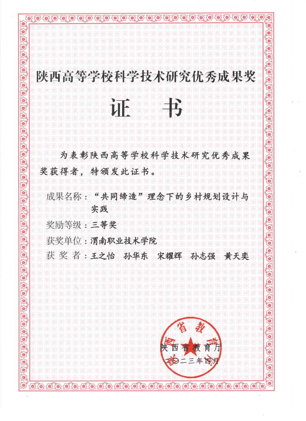 陕西省高等学校科学技术研究优秀成果三等奖证书