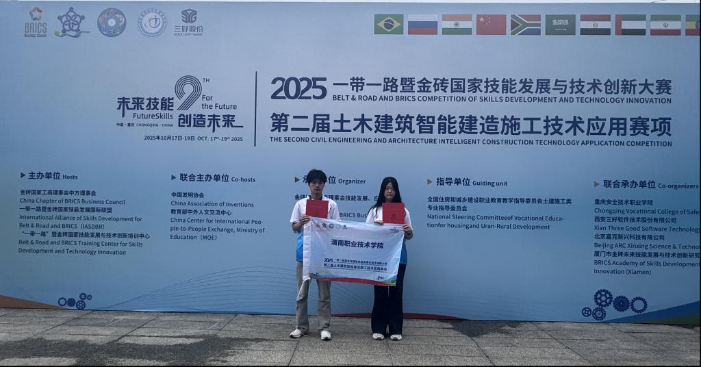 10月17日至19日,2025“一带一路”暨金砖国家技能发展与技术创新大赛之第二届土木建筑智能建造施工技术应用赛项决赛,在重庆安全技术职业学院落下帷幕。来自全国800余所院校、近6000名师生参与选拔,覆盖范围从传统土木强校延伸至新兴开设智能建造专业的院校,最终角逐出298支队伍入围决赛。bat365韩朝阳、李璟瑶同学凭借扎实的专业知识和出色的实践能力,在激烈竞争中脱颖而出,荣获全国三等奖。